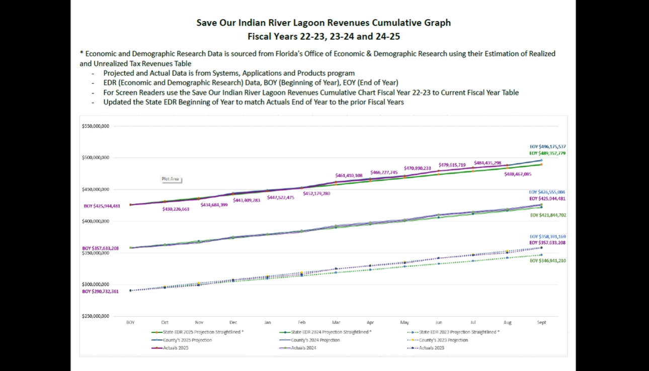 Program Director, Virginia Barker, provided an additional revenue update, discussing the proposed FY2026-27 state budget for environmental restoration. The state has allocated $100 million for estuary restoration efforts, to be shared with all lagoon counties and Biscayne Bay.
