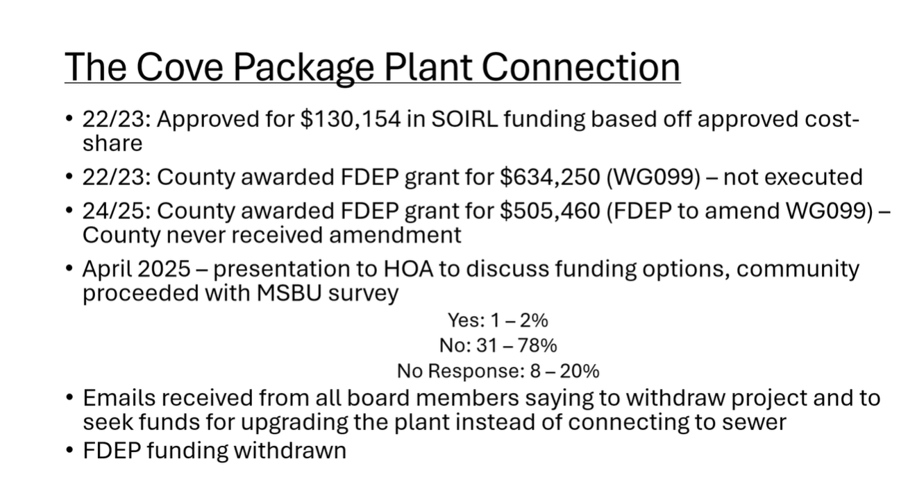 The Cove Package Plant Connection project, previously part of the SOIRL Project Plan, has been withdrawn, as reported by Terri Breeden. This withdrawal also removes the associated funding from the FDEP grant WG099. The Cove’s decision to remove its project was made based on the lack of homeowner support in an MSBU survey. The Cove will instead seek funds to upgrade the package plant.