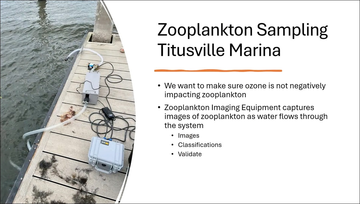 Environmental Specialist Aleah Ataman presented on a privately funded pilot project at the Titusville Marina that injects ozone-enriched nanobubbles into the water to evaluate their potential to break down accumulated muck on the marina floor.