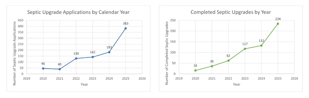 - Septic Upgrades: 30 additional homeowner upgrades reimbursed (594 completed; 929 agreements executed).